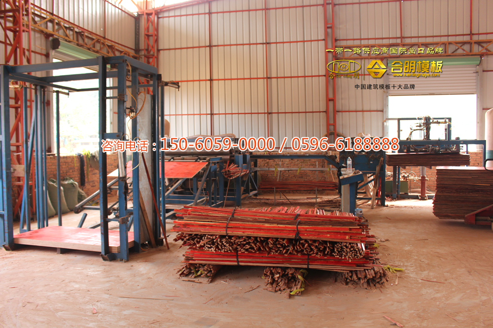 合明模板生產(chǎn)分為滾膠、排板、冷壓、熱壓、裁板、成品包裝等步驟。