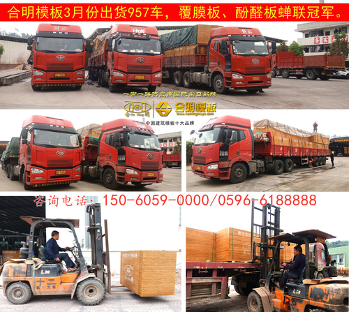 3月份,合明模板出貨量大大增加,創(chuàng)歷史新高:建筑模板發(fā)貨957車,建筑木方發(fā)貨303車,出口建筑模板102個(gè)貨柜,總計(jì)1362車,比去年3月份增長(zhǎng)45%。