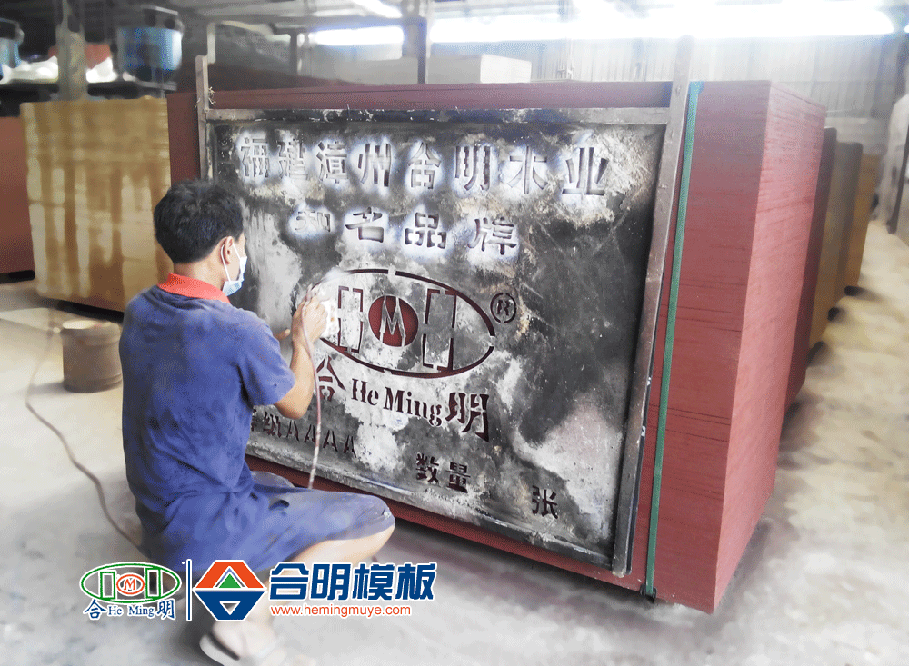 模板成品疊放整齊,四邊噴涂油性防水漆,再噴合明木業(yè)知名品牌專屬商標。