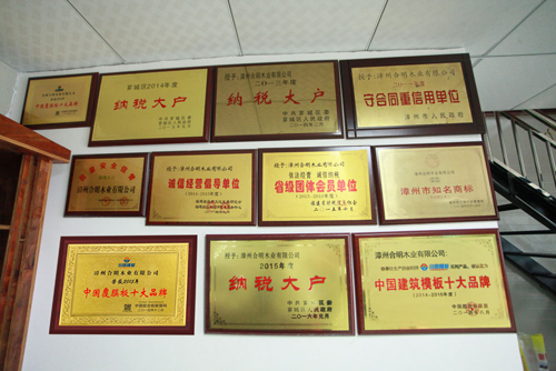 合明木業(yè)規(guī)模宏大,銷量領(lǐng)居漳州首位,連續(xù)三年被評為納稅大戶。公司也因規(guī)范管理及誠信經(jīng)營被評為“誠信經(jīng)營倡導(dǎo)單位”、“質(zhì)量安全信譽(yù)單位”、“最佳誠信合作單位”等。合明品牌模板則憑借長期的質(zhì)量保證通過ISO9001質(zhì)量管理體系認(rèn)證,并獲得“中國著名品牌”、“中國建筑模板十大品牌”、“中國覆膜板十大品牌”、“知名商標(biāo)”等榮譽(yù)稱號。